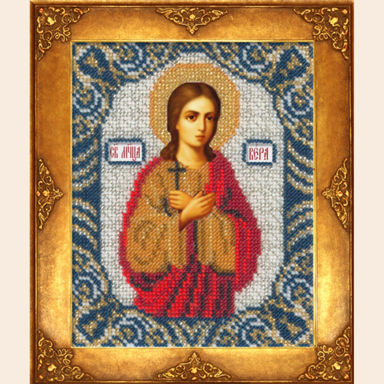 В наборе: ткань с нанесенным рисунком, бисер (Чехия), игла, описание работы. Размер: 12,5х16,3смь девочки Веры 12-ти лет, принявшей мученическую кончину за веру Христову, именины отмечаются 30 сентября по н.с.
